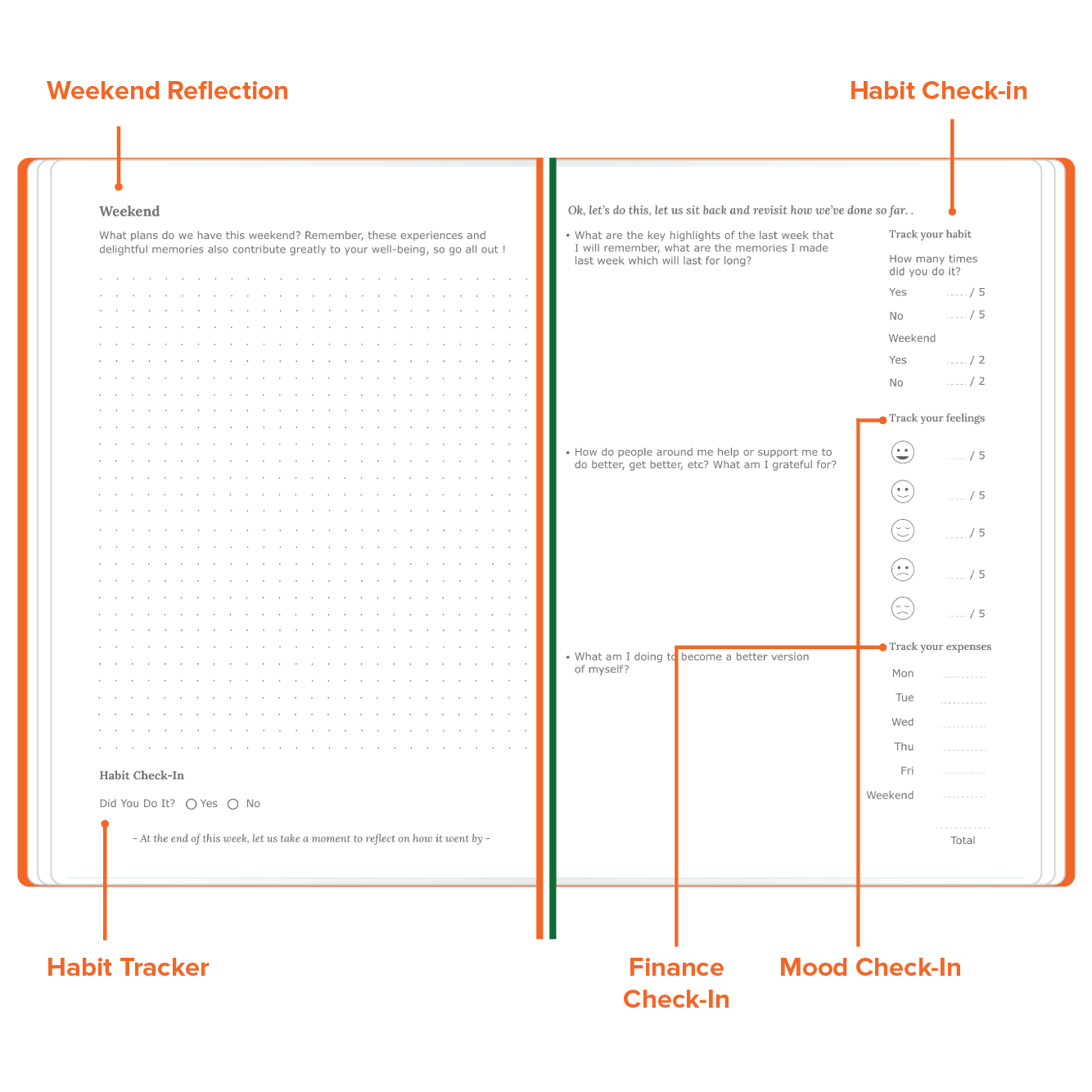 Your weekends are an essential part of your wellbeing journey. With planner's designated sections for weekend recaps, you have the opportunity to reflect on your progress, recharge your energy, and set new intentions for the upcoming week.